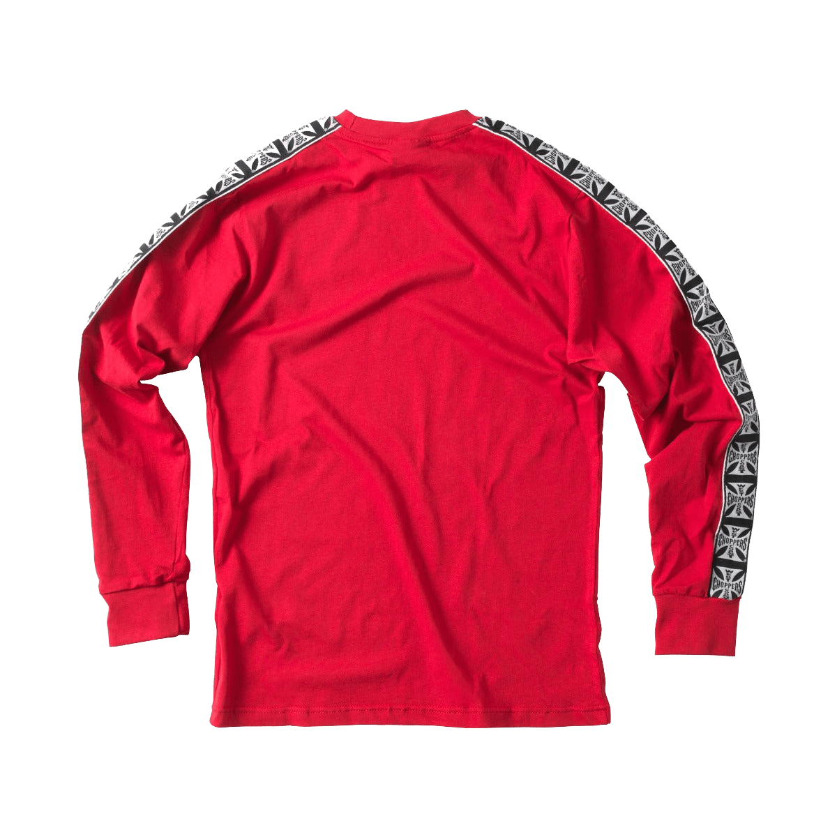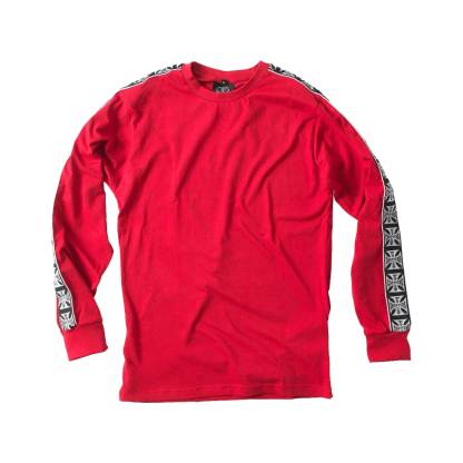 RETRO TAPED LONG SLEEVE TEE MADE OF 100% COTTON IN RED, THE TAPING RUNS FULL OVER SHOULDER AND SLEEVES
