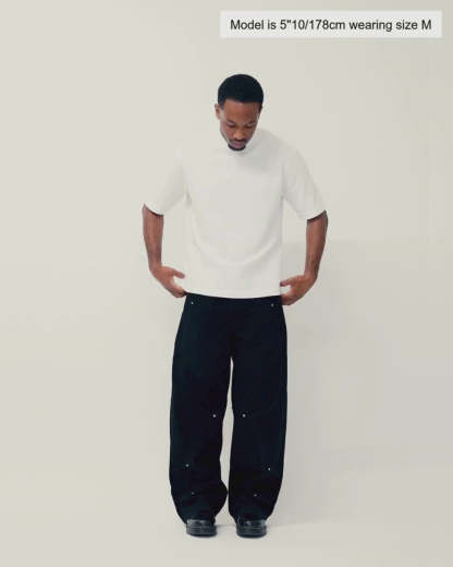 Cut from pure black denim with custom panelling and metal rivet detailing. Back pocket embroidery of a medieval knight resting on a vibrant bed of flowers, with contrasting silver armour and red accents with rich green, yellow, and red blooms. Finished with a debossed leather tab and engraved sword carabiner.