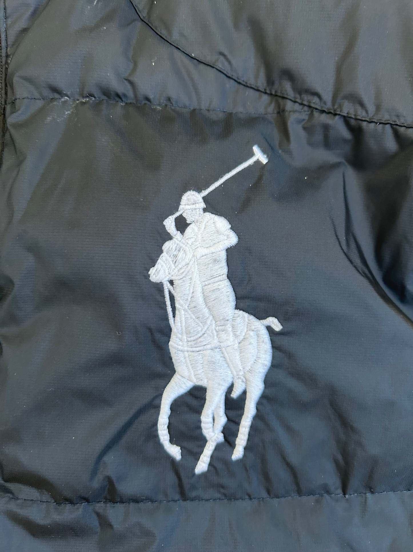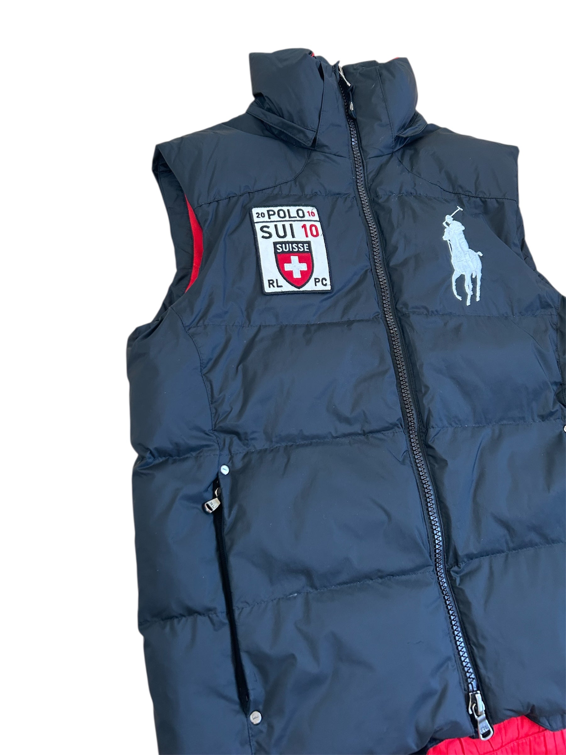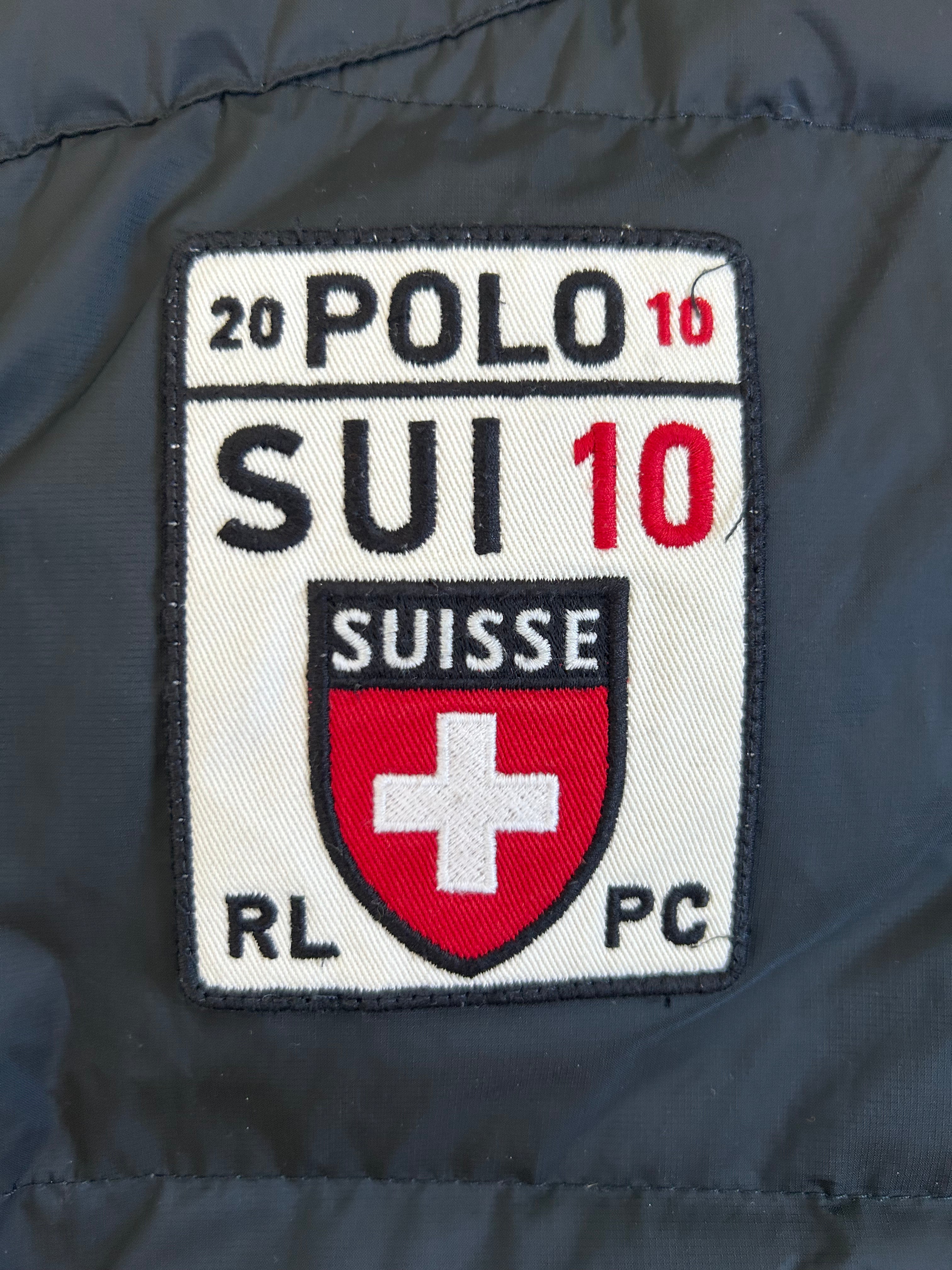 Crafted from premium down-filled material, it features the oversized Big Pony logo, an embroidered "Suisse" crest with the Swiss flag, and the number 10 patch—reflecting the sporty aesthetics typical of Ralph Lauren’s international lineup. No longer in production, making it a rare and collectible item for Ralph Lauren enthusiasts.