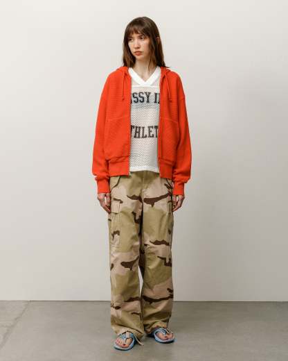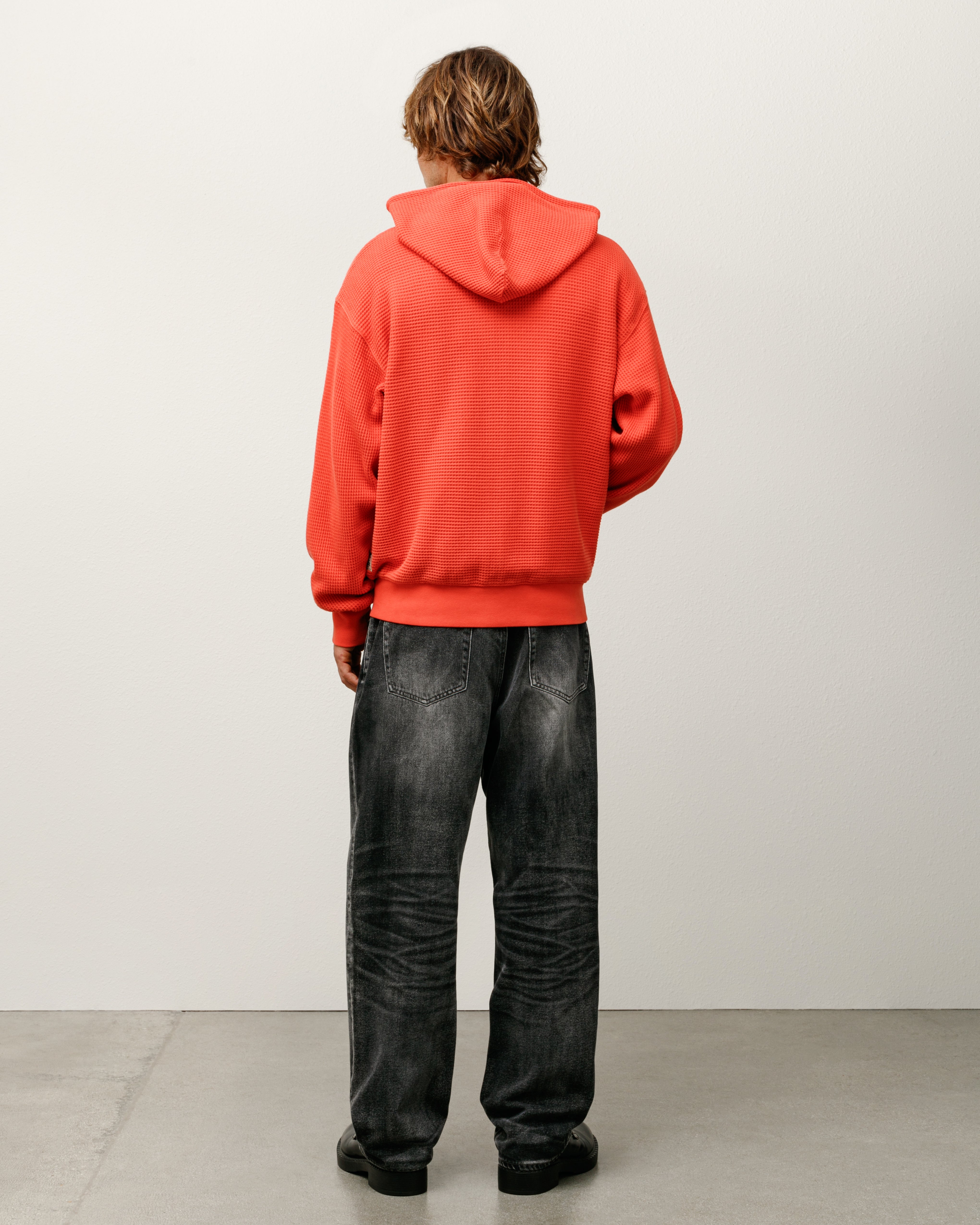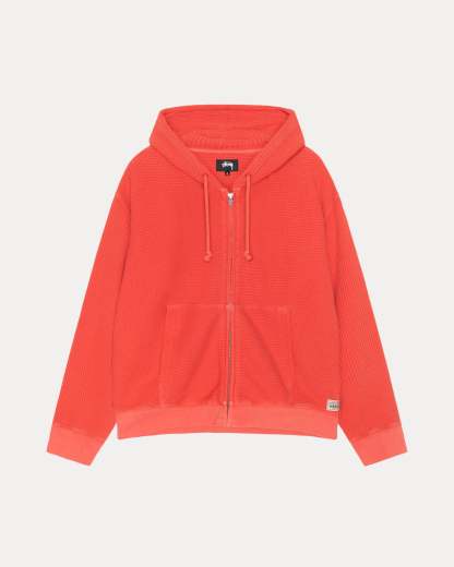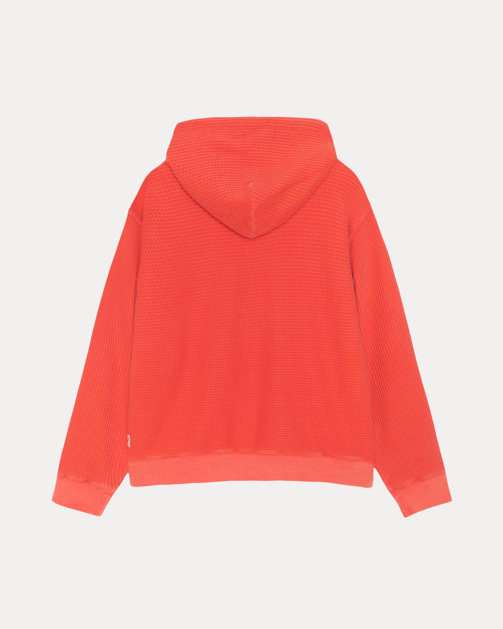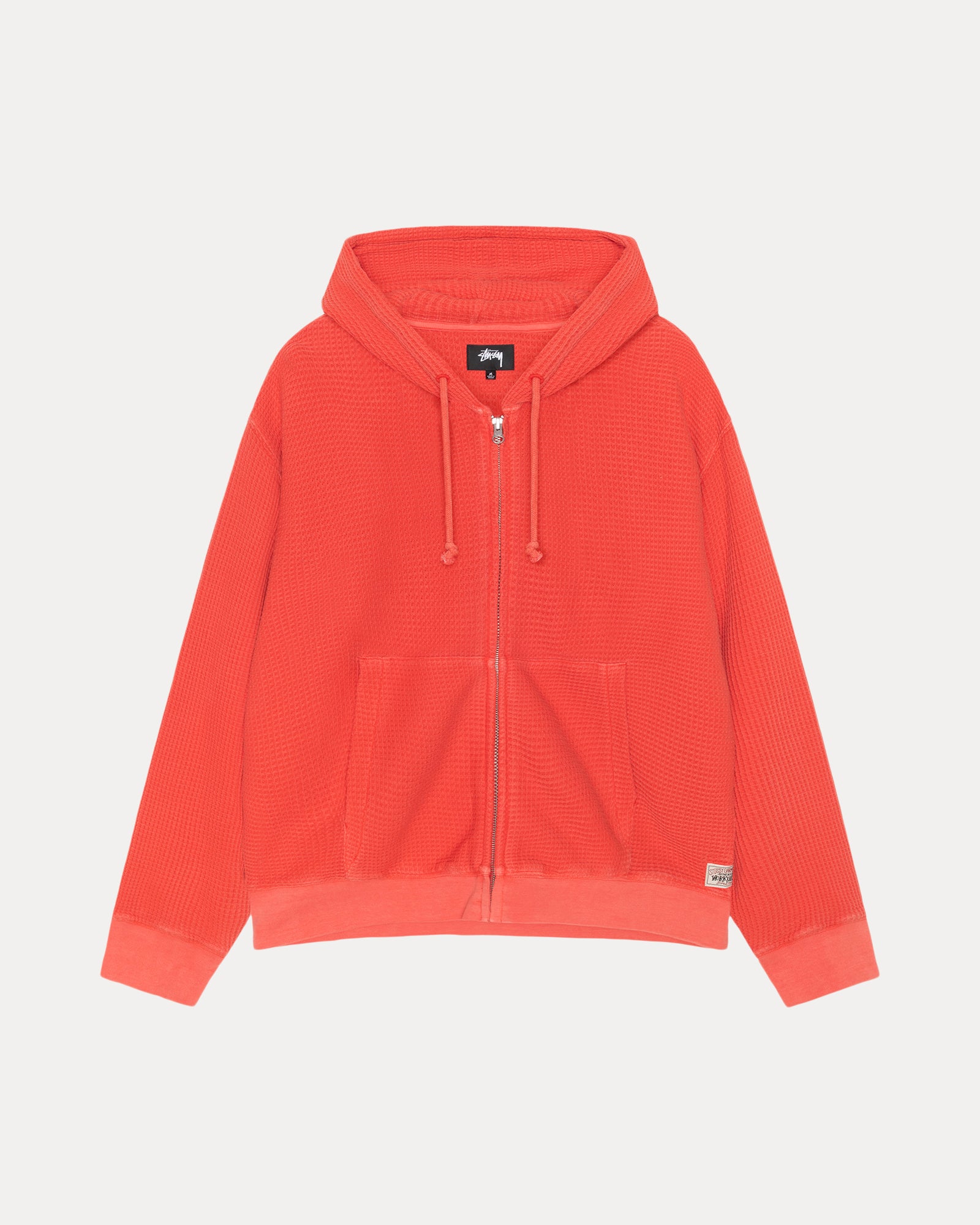 Relaxed fit waffle knit hoodie in double-layered 310gsm pigment dyed cotton. Stüssy authentic workgear label at side seam.