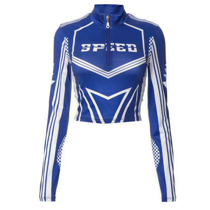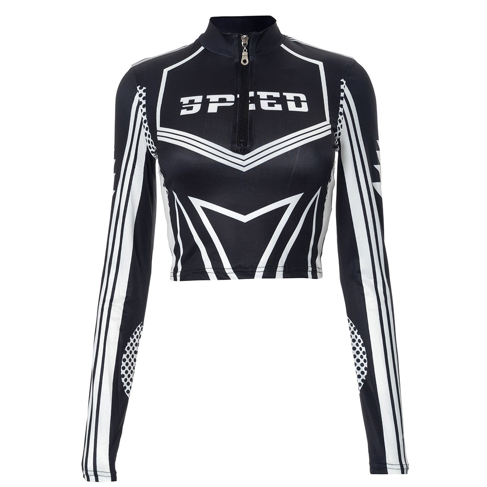 Street Hipster Trend Biker Style Printed Zipper Half High Neck Long Sleeve Top