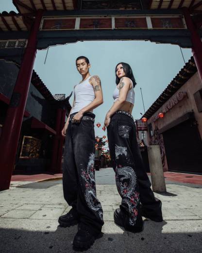 Unleash bold energy with our Dragon Embroidery Denim — where East Asian artistry meets modern streetwear. These light-wash baggy jeans feature an intricate black dragon winding down the leg, brought to life with pops of pink cherry blossoms and traditional script-style accents.