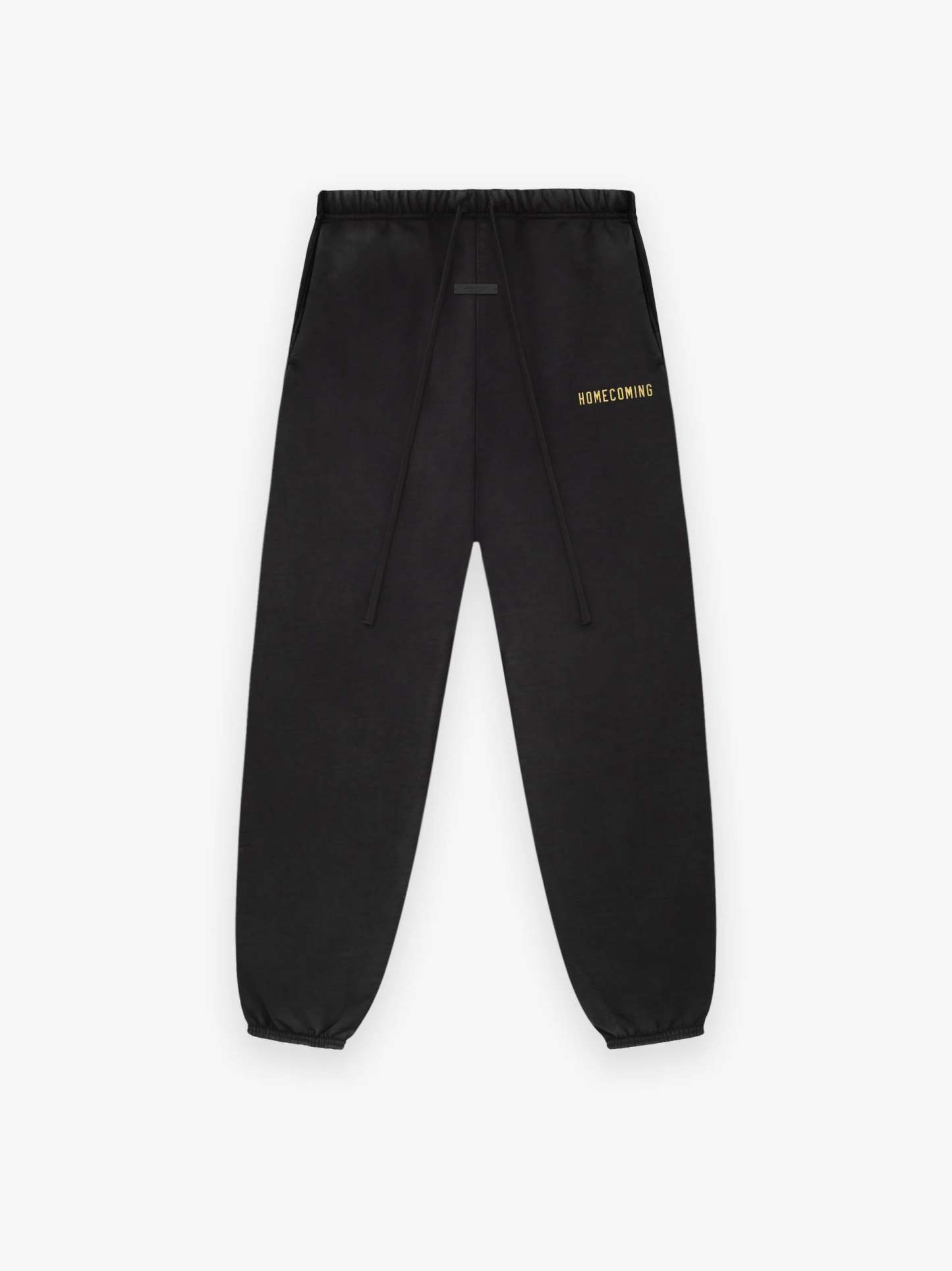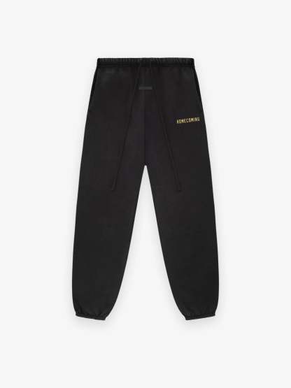 The Heavy Fleece Sweatpant is made from heavyweight 520gsm, 100% cotton fleece in a subtle vintage wash. A collegiate-inspired "Homecoming" graphic is screen-printed on the leg. Additional details include an encased elastic waistband with elongated drawstrings, and side seam pockets. The Essentials Fear of God rubberized label is at the center front.