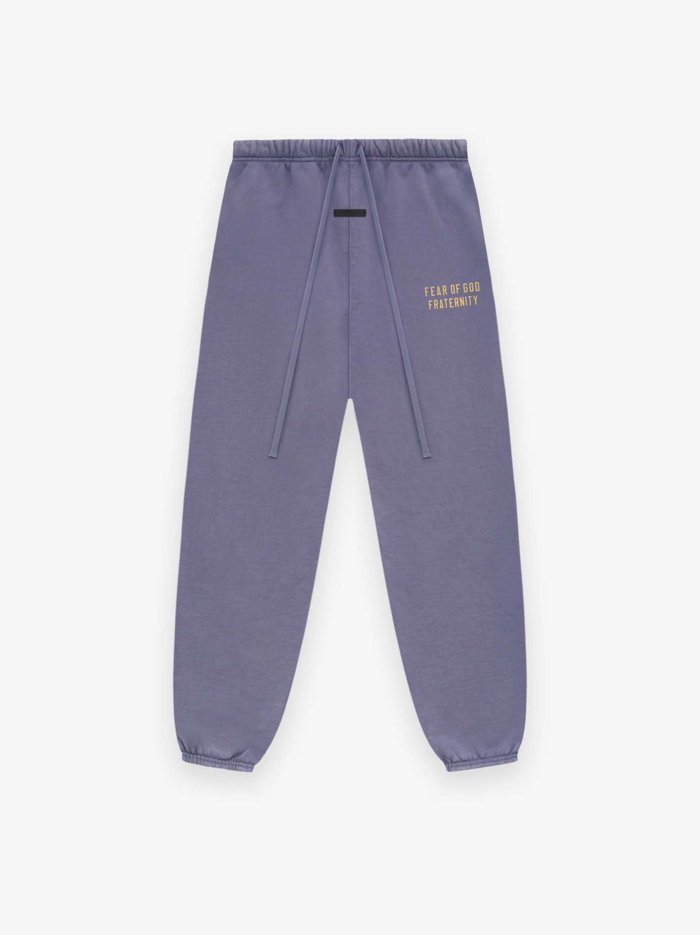 The Heavy Fleece Sweatpant is made from heavyweight 520gsm, 100% cotton fleece in a vintage wash. A collegiate-inspired "Fear of God Fraternity" graphic is screen-printed on the leg. Additional details include an encased elastic waistband with elongated drawstrings, side seam pockets, and elastic ankle hems. The Essentials Fear of God rubberized label is at the center front.