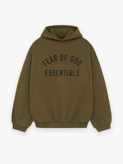 The Essentials Fleece Hoodie has been upgraded in a heavier 480gsm core fleece to provide additional body and structure. A collegiate-inspired "Fear of God Essentials" graphic is screen printed on the front. Details include an overlapped neckline hoodie, rib-knit cuffs, waist-hem, and side pockets. The Essentials Fear of God rubberized label is at the back collar.