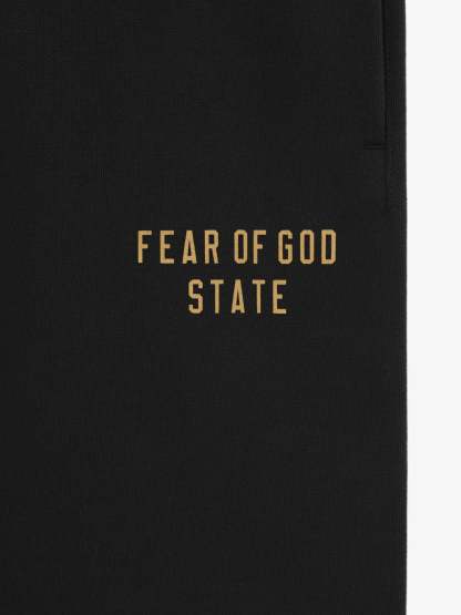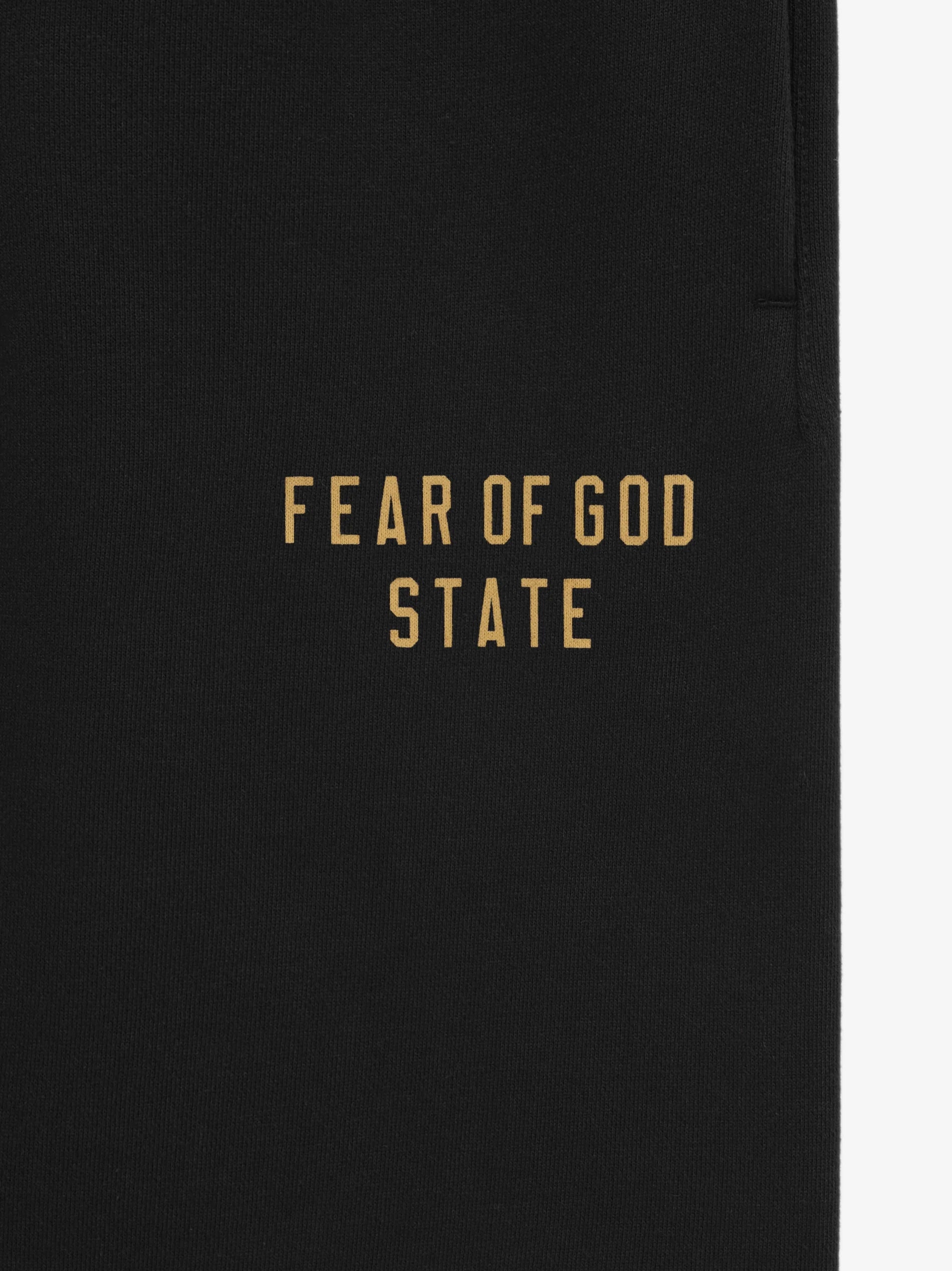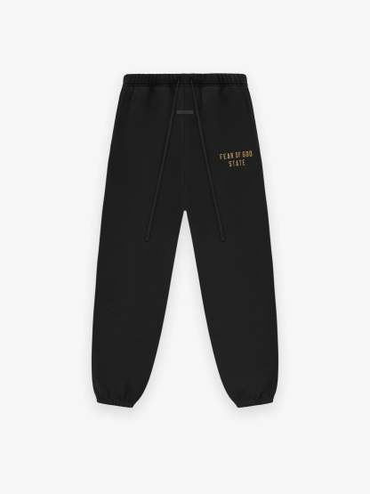 The Essentials Sweatpant has been upgraded in a heavier 480gsm core fleece to provide additional body and structure. A "Fear of God State" collegiate graphic is screen-printed on the leg. Additional details include an encased elastic waistband with elongated drawstrings, and side seam pockets. The Essentials Fear of God rubberized label is at the center front.