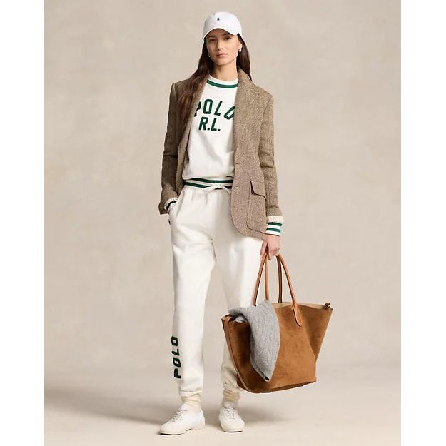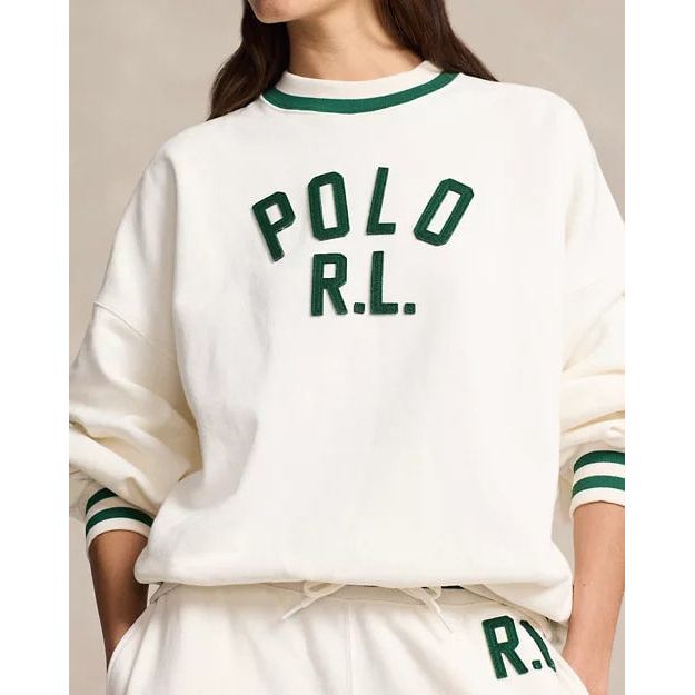 Felt patches spell out Polo's signature logo at the front of this crewneck sweatshirt, which is made with soft fleece and trimmed with contrast stripes on the collar, cuffs and hem.