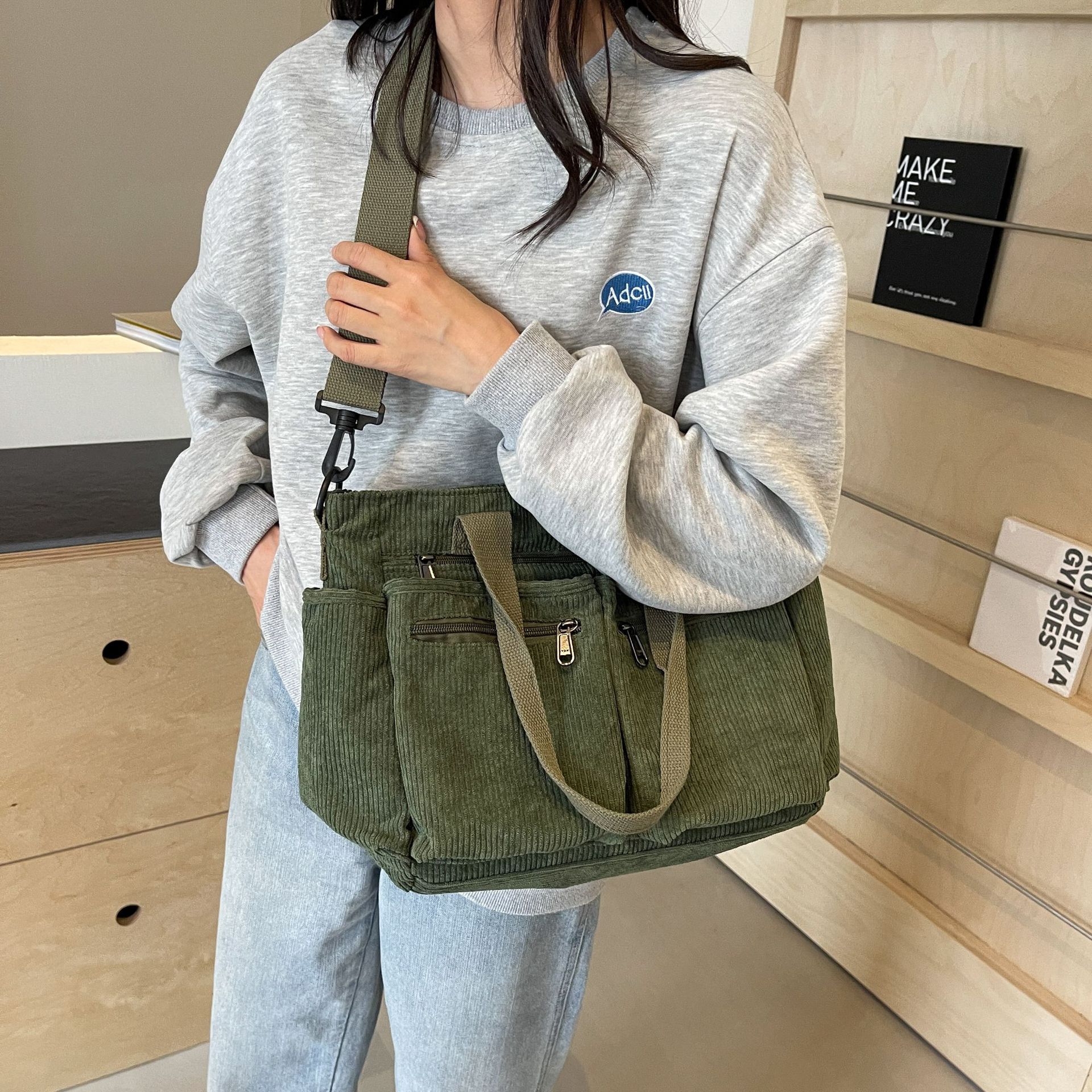 This corduroy tote bag with adjustable shoulder straps has multiple compartments for storing your essentials, such as the main pocket with zipper Interior small zipper pocket, 1 open pocket and 3 front zipper pockets for easy storage of cell phone, keys, cards, change, tissue, umbrella, bottle, etc. Practical design meets all your needs!
