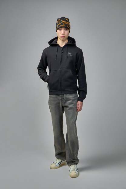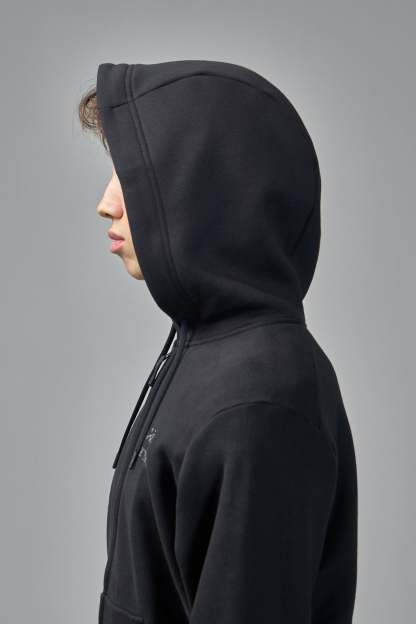 Zip-up hoodie featuring a sleek black design with a front zipper and hood. The comfortable fit and practical pockets make it ideal for casual wear.