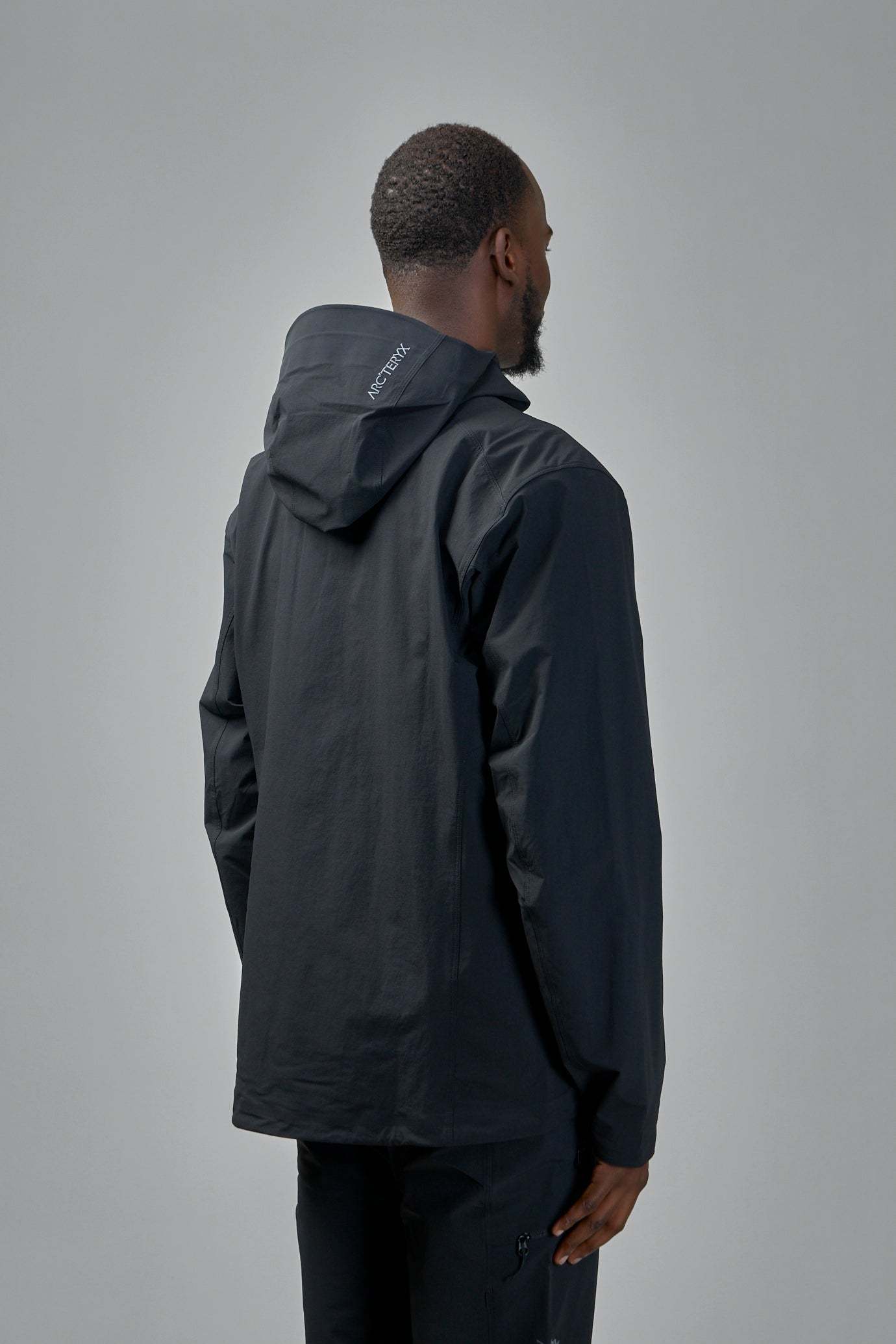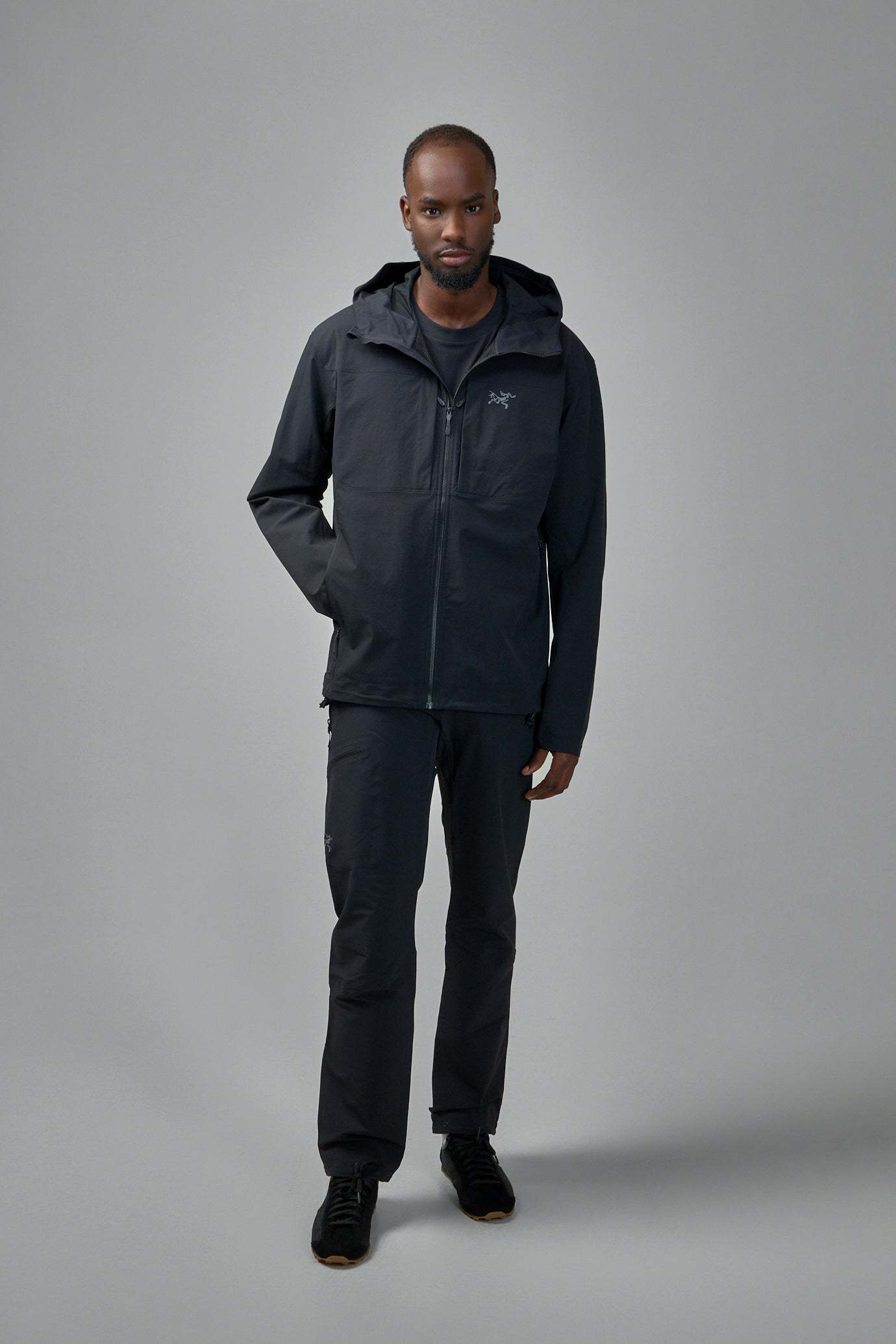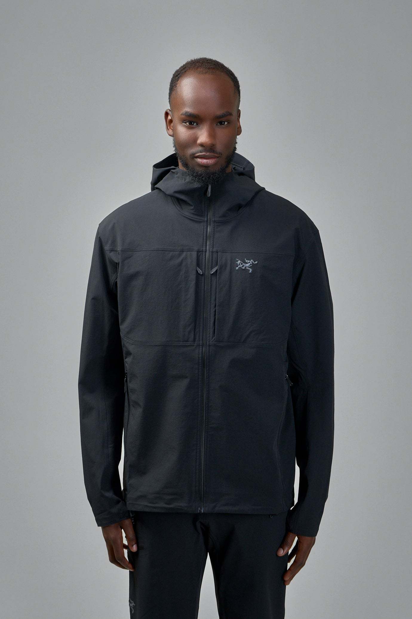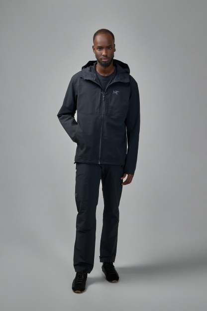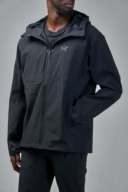 The ARC'TERYX Gamma Hoody is a men's solid black jacket features long sleeves and a prominent front zipper closure. This hooded jacket offers practical style with two visible zippered side pockets. Designed for versatility, it includes an adjustable hem.
