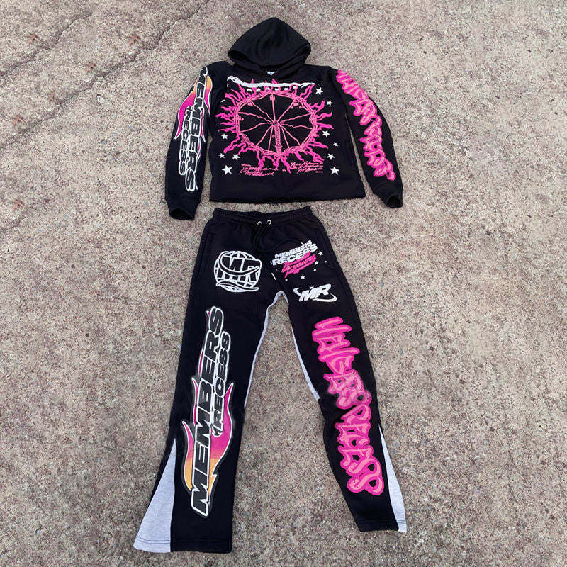 Amusement park print casual street patchwork trousers and hoodie two-piece set