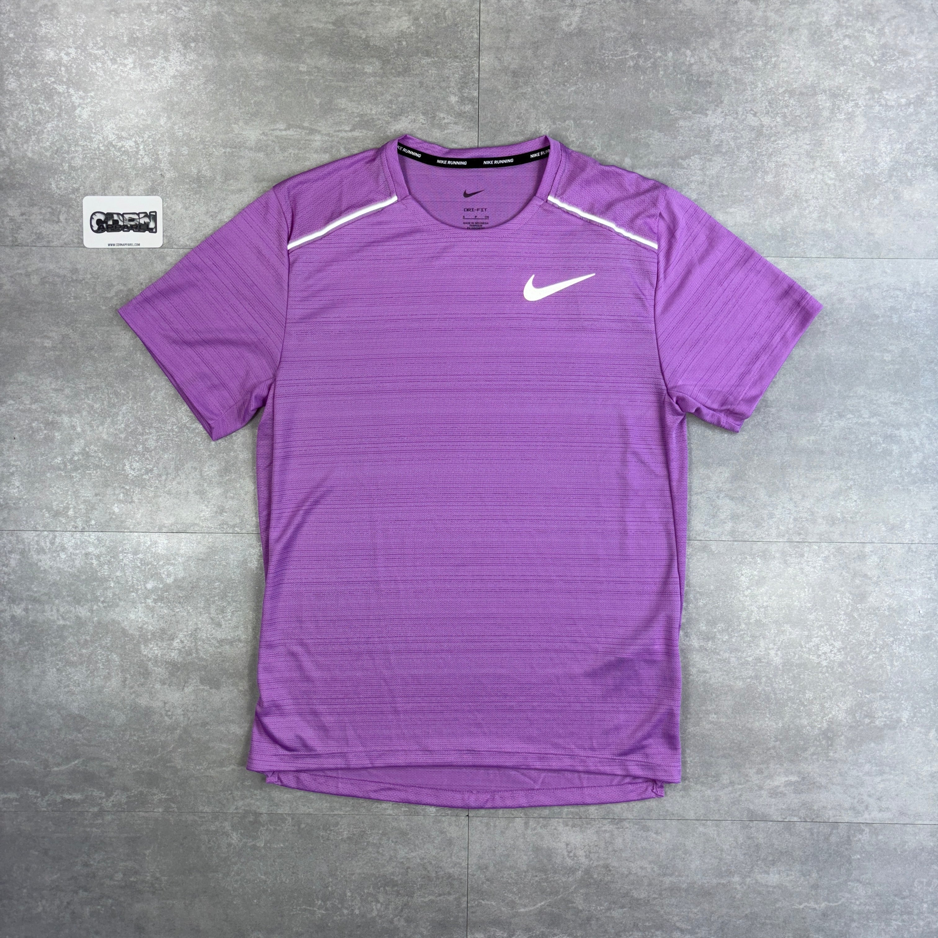 Step up your wardrobe in this men's Miler Short Sleeve T-Shirt from Nike. In an Lilac colourway, this standard-fit tee is made from breathable poly fabric with Dri-FIT tech to keep away sweat and keep you cool. It features a crew neckline, short sleeves and reflective details to keep you seen after dark. With a dropped hem for extra coverage. Paired flawlessly with the Grey Nike Flex Stride Shorts, this set is the epitome of rare and hard-to-find activewear. This running tee is finished with the signature Swoosh logo to the chest. Machine washable.