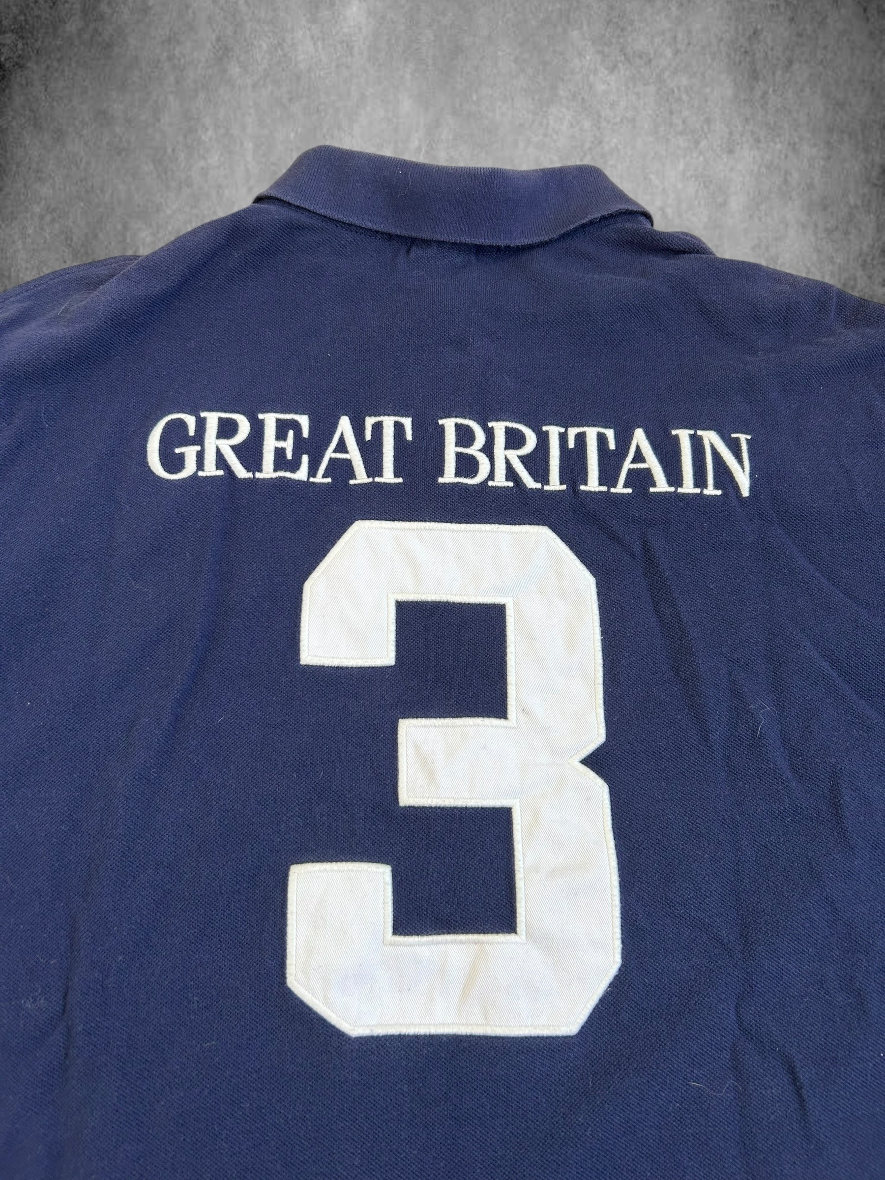 Made from 100% high-quality cotton, it features the Big Pony logo, bold “GREAT BRITAIN” lettering, an embroidered Great Britain flag crest, and the number 3 on the right sleeve—a signature detail in Ralph Lauren’s polo designs. No longer in production, making it a rare and collectible item for Ralph Lauren enthusiasts.
