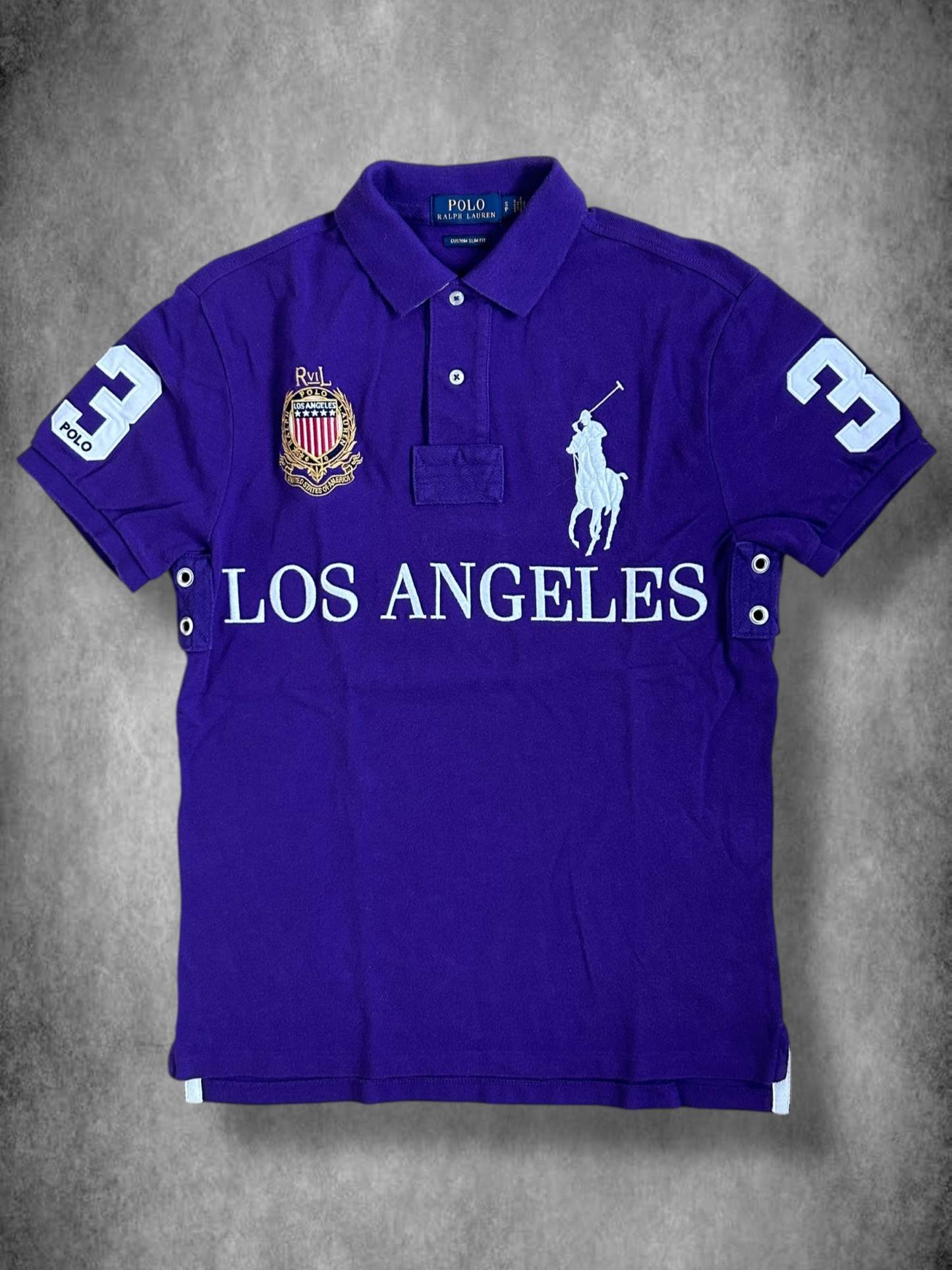 Made from 100% high-quality cotton, it features the Big Pony logo, bold "LOS ANGELES" lettering, an embroidered USA crest emblem, and the number 3 on both sleeves—a signature detail in Ralph Lauren’s polo designs. No longer in production, making it a rare and collectible item for Ralph Lauren enthusiasts.