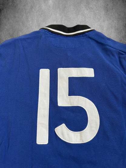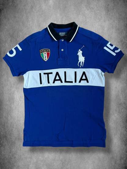 Made from 100% high-quality cotton, it has a bold blue and white color scheme with "ITALIA" across the chest, making it a sought-after piece for collectors and fans of Ralph Lauren's international-themed designs.