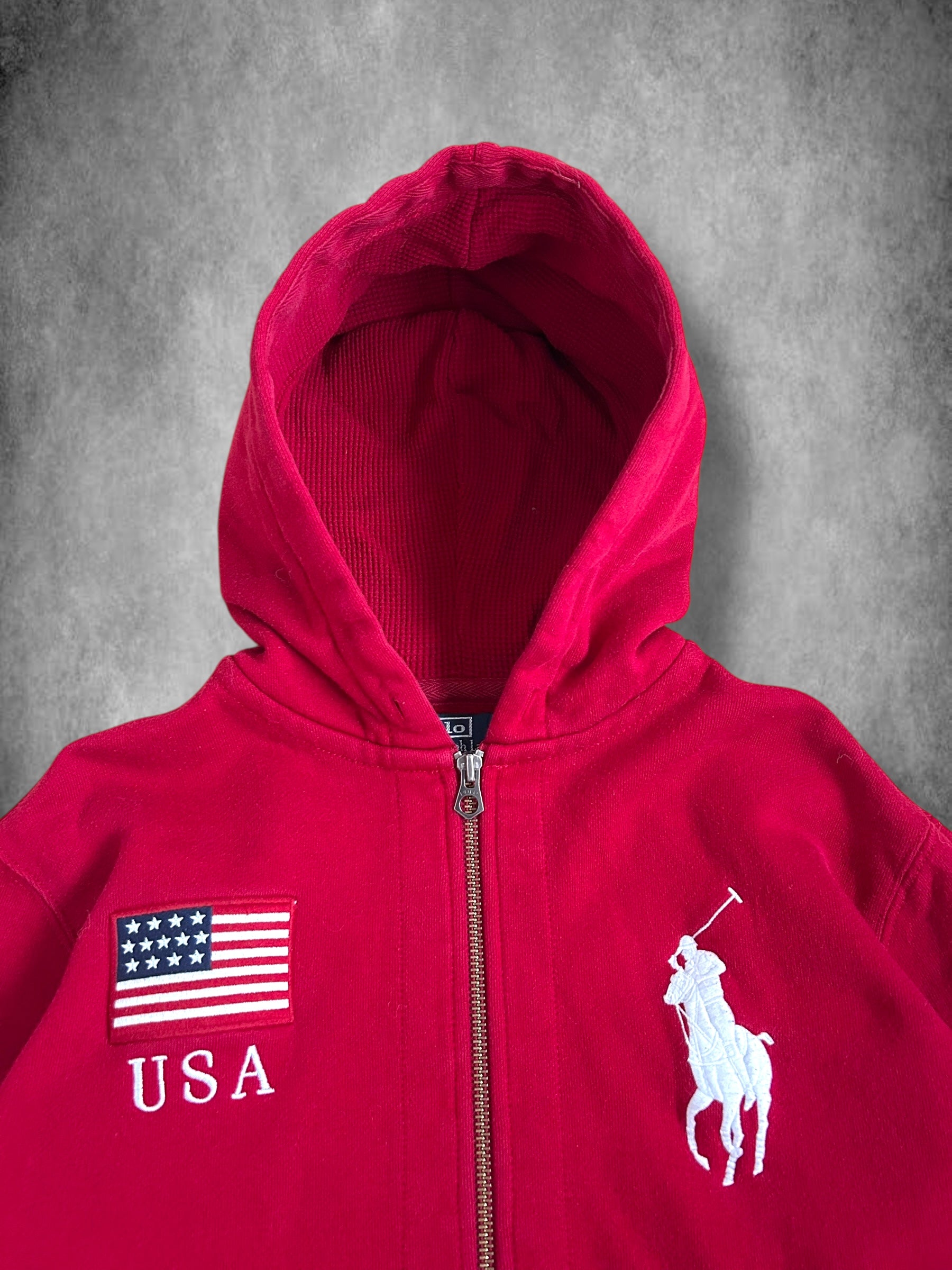 This Ralph Lauren USA Big Pony Zipper Hoodie is a standout piece from the Polo Ralph Lauren International Team Collection, celebrating America’s rich sporting heritage. Originally released in the 2010s, this polo was available for a limited timeat Ralph Lauren stores and select retailers.