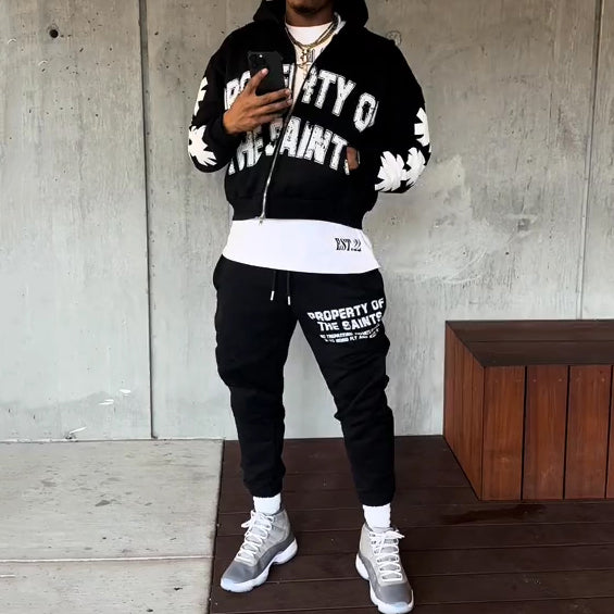 Property Of The Saints Print Zipper Hoodie Two Piece Set