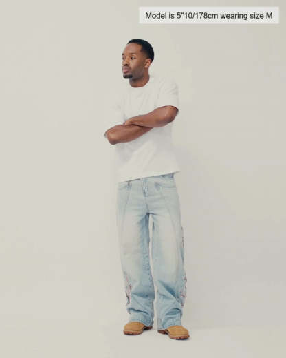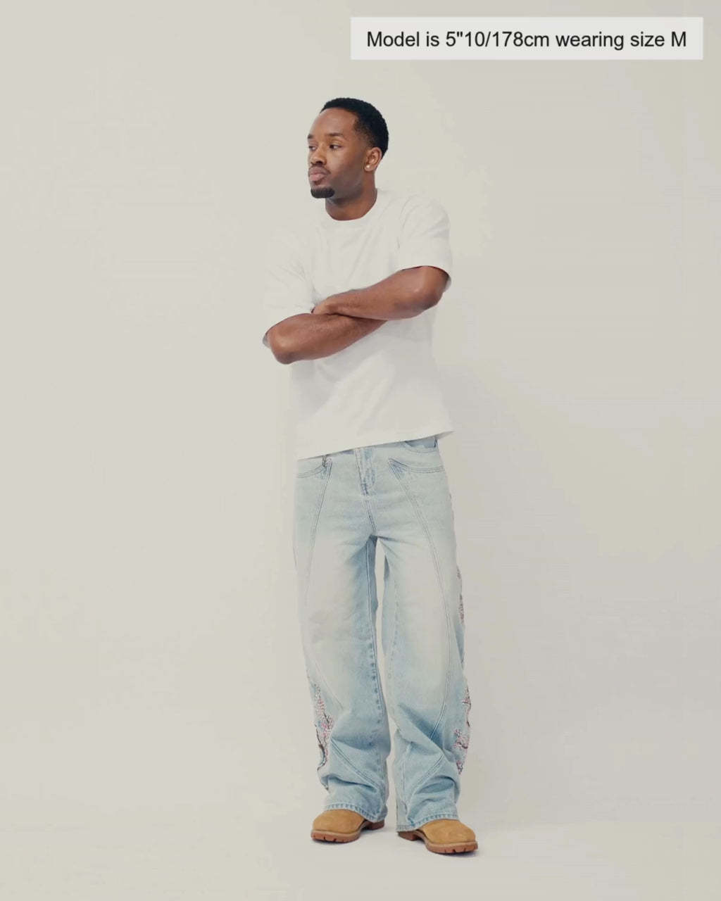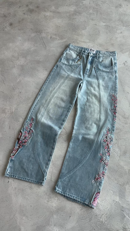 Crafted in a washed light blue finish with custom panelling on the front and back. Back embroidery depicting a knight beneath a blooming cherry blossom tree, with branches extending to the front panels. Finished with a custom leather tab, metal sword carabiner & 1,000,000+ stitches.