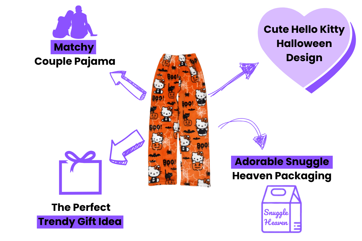 Featuring an adorable Halloween-themed design with Hello Kitty, pumpkins, bats, and playful "Boo!" details, these soft and cozy fleece pants are perfect for staying comfy while embracing the festive spirit.