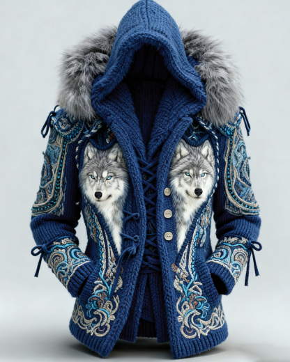 Winter Fashion Nordic Viking Tribal Wolf Totem 3D Embroidered Knitted Hooded Jacket 8149
