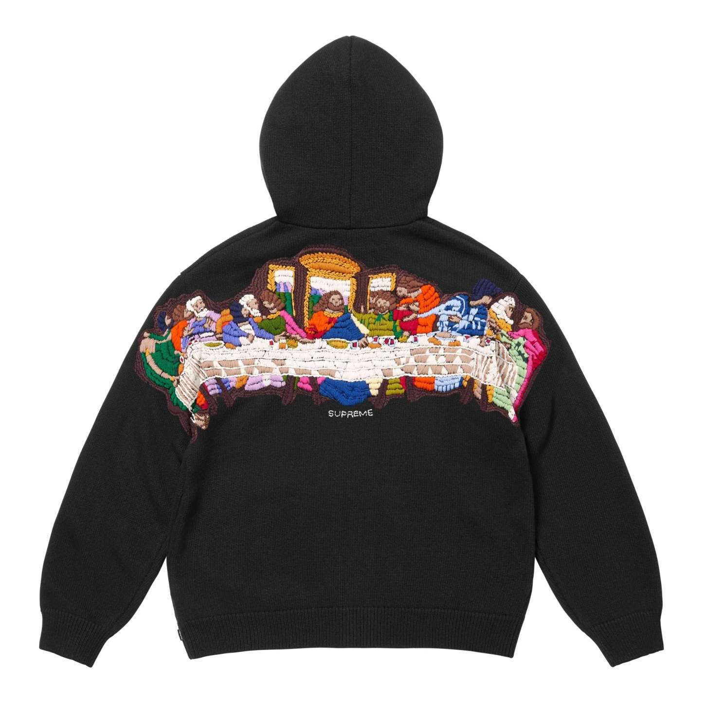 The Supreme Last Supper Embroidered Zip Hoodie in black combines comfort with an artistic aesthetic. Crafted from heavyweight cotton, it features detailed embroidery depicting “The Last Supper,” creating a bold and refined streetwear look.