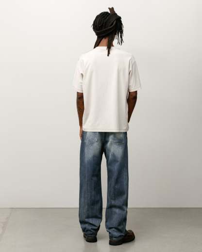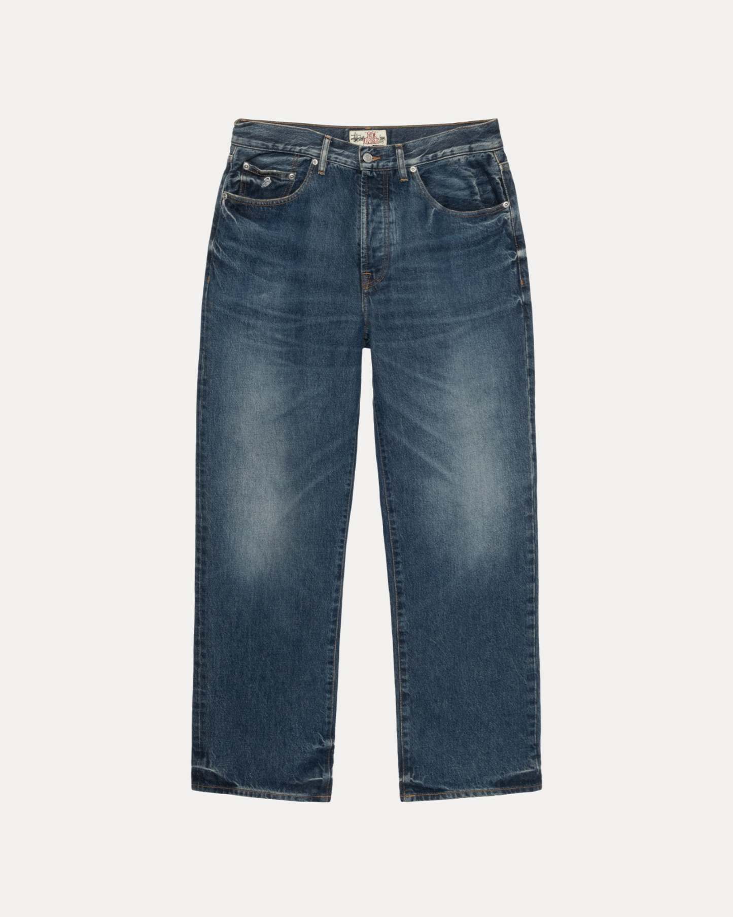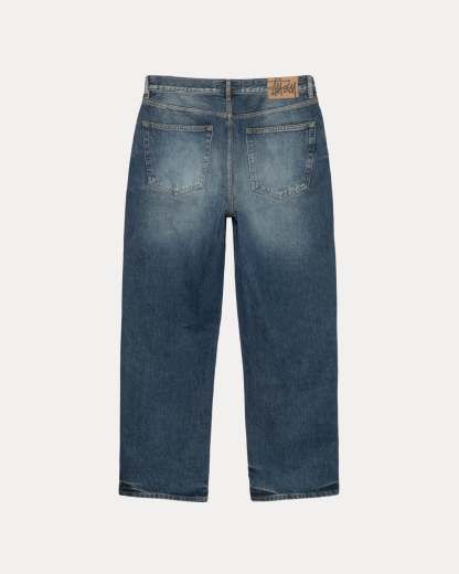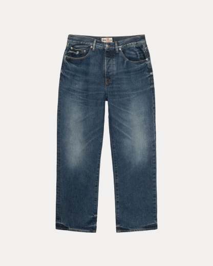 Classic fit jean in 14.5oz denim with a vintage stonewash treatment. Regular waist with a mid rise, straight cut, and slimmest leg opening of Stüssy's denim range. Features branded nickel shank hardware and a suede Stüssy logo patch. Fits true to size.