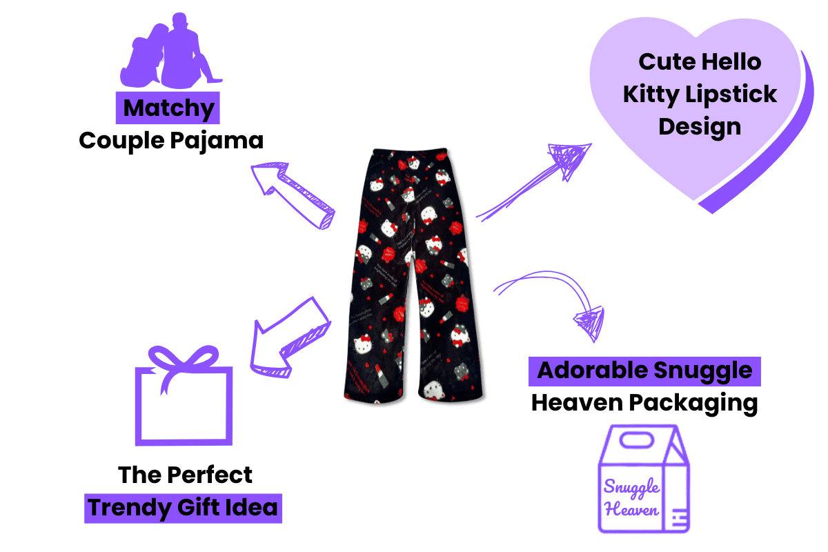 Featuring an adorable Hello Kitty-themed design with cute and playful lipstick details, these soft and cozy fleece pants are perfect for staying comfy while embracing the snuggly spirit.