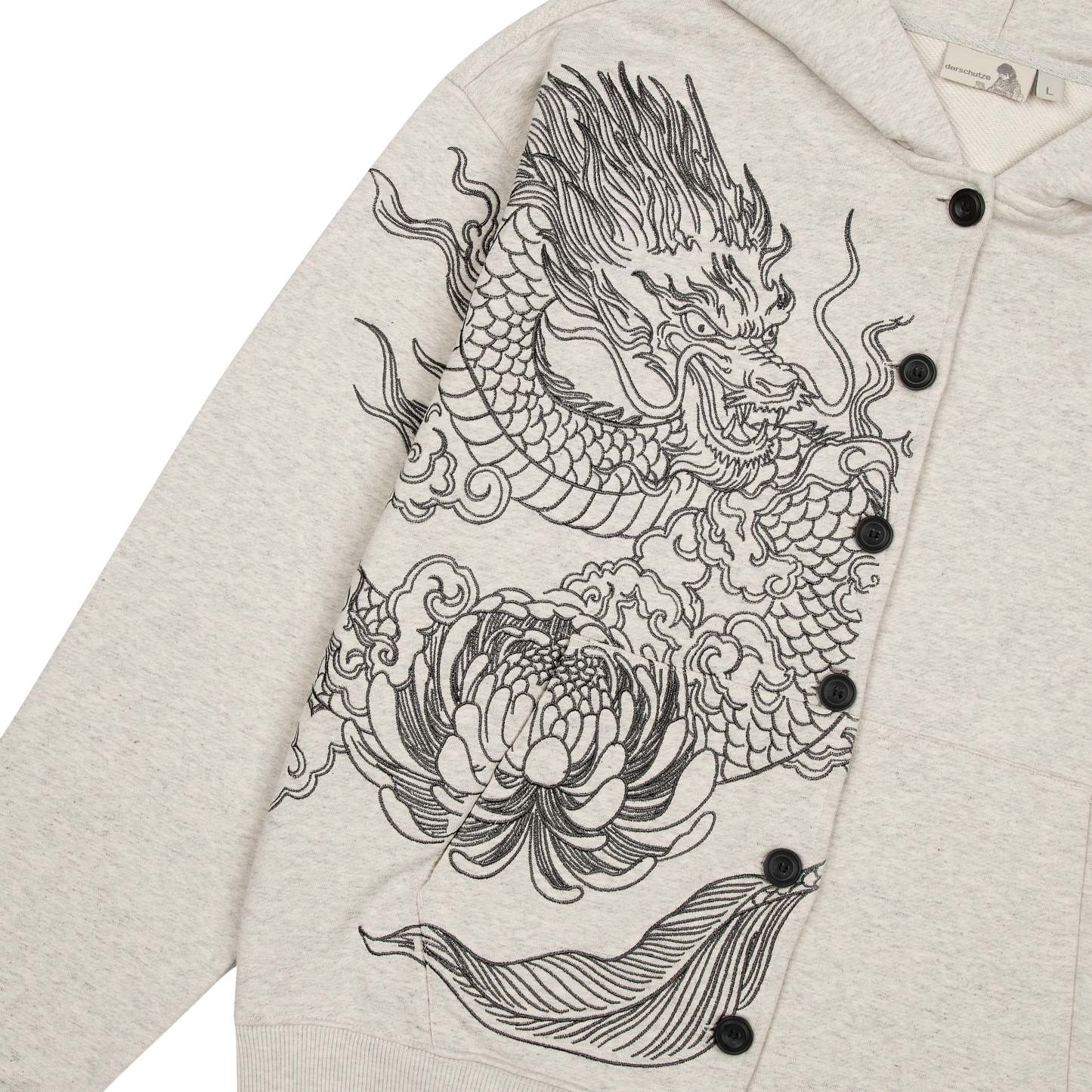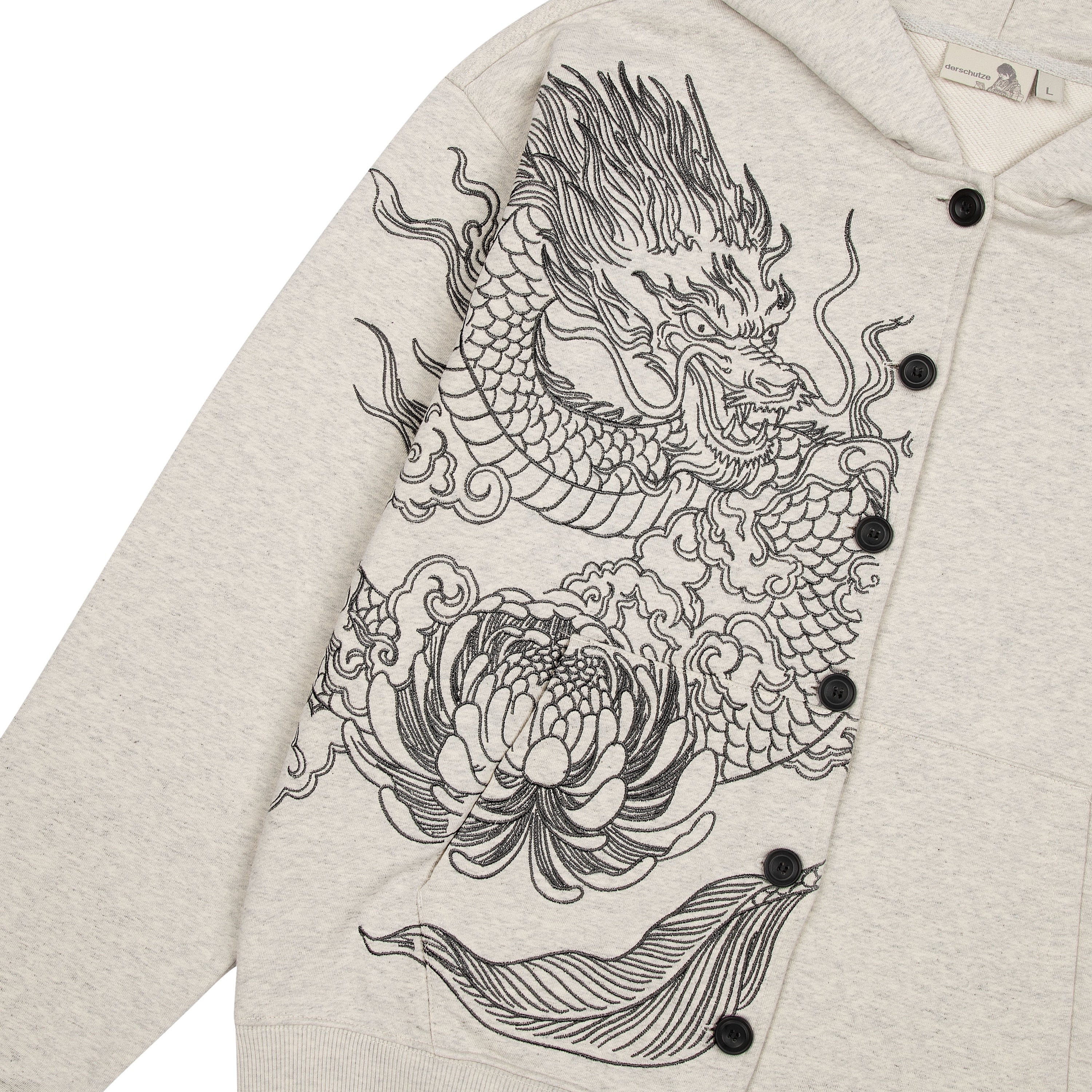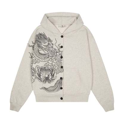 460gsm / 100% preshrunk cotton / embroidery on front and sleeve / with buttons / without cord / fits true to size